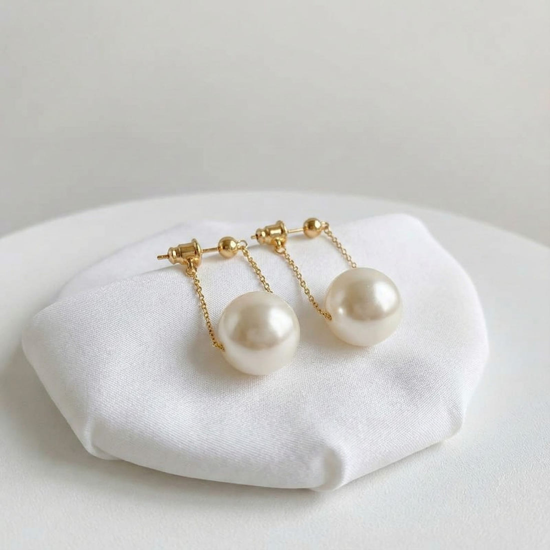 Hijawellers Elegant 18K Gold Plated Hanging Pearl Drop Earrings – Classic Front-Back Chain Design